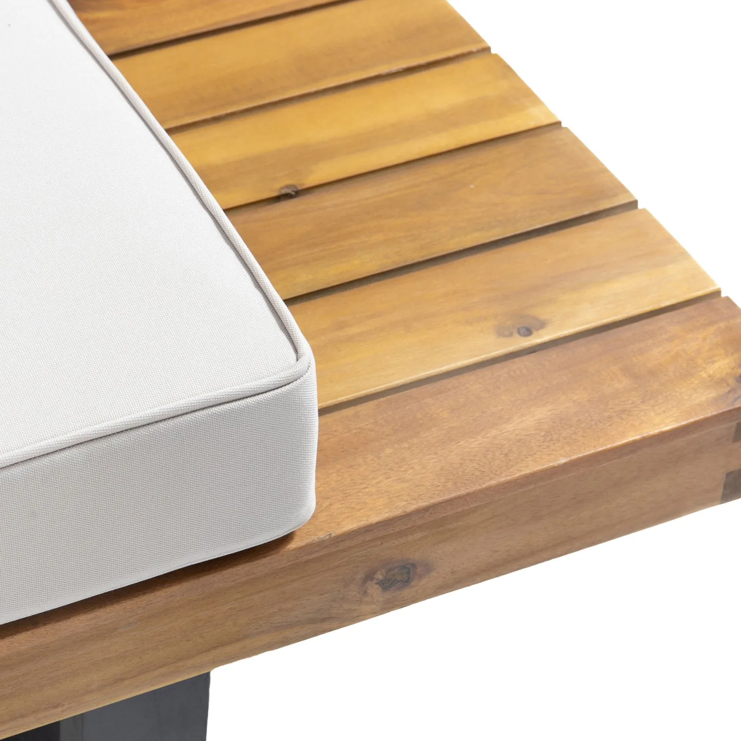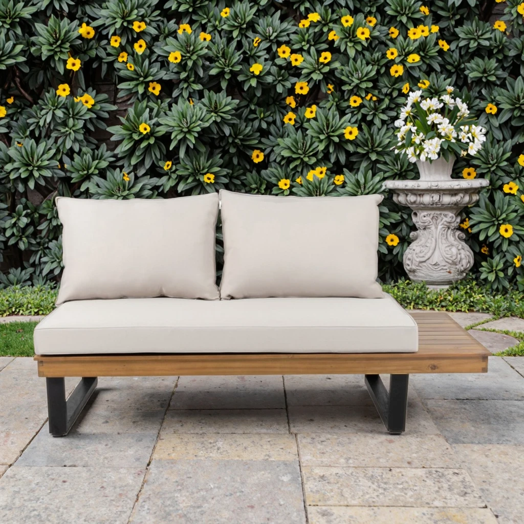 2-Seater Wooden Sofa Set Right Side Outdoor Sofa Beige Cushions Acacia Wood Frame Black Metal Legs for Hotel Villa Use