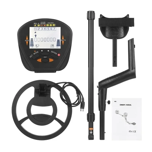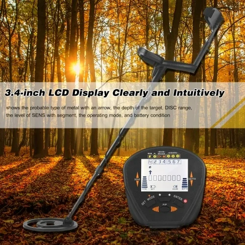-3.4-inch LCD Display: shows the probable type of metal with an arrow, the depth of the target, DISC range, the level of SENS with segment, the operating mode, and battery condition.