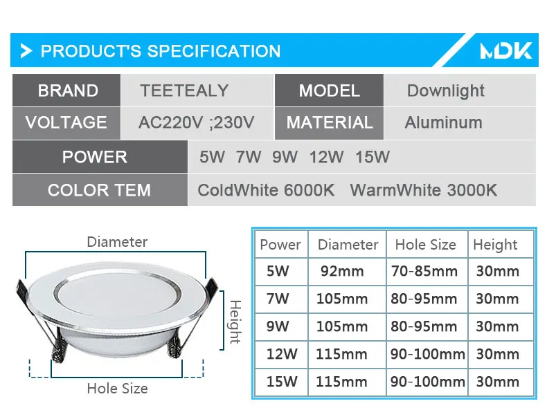 3. Power: 5W 7W 9W 12W 15W  Driverless LED Down Light
