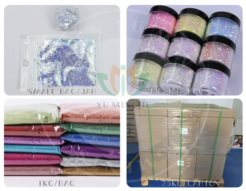Glitter sizes(HEX shape)-1/8"(3mm), 1/10"(2.5mm), 1/12"(2mm), 1/16"(1.6mm), 1/20"(1.3mm), 1/24"(1mm), 1/32"(0.8mm), 1/40"(0.6mm), 1/64"(0.4mm), 1/96"(0.3mm), 1/128"(0.2mm), 1/256"(0.1mm), 1/350"(0.07mm), 1/500"(0.05mm).