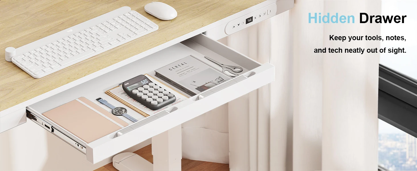 * SPACIOUS METAL DRAWER – Organize essentials with a hidden under-desk drawer ideal for notebooks, accessories, and cables. The sturdy metal design blends seamlessly with the desk while adding functional storage to your office setup