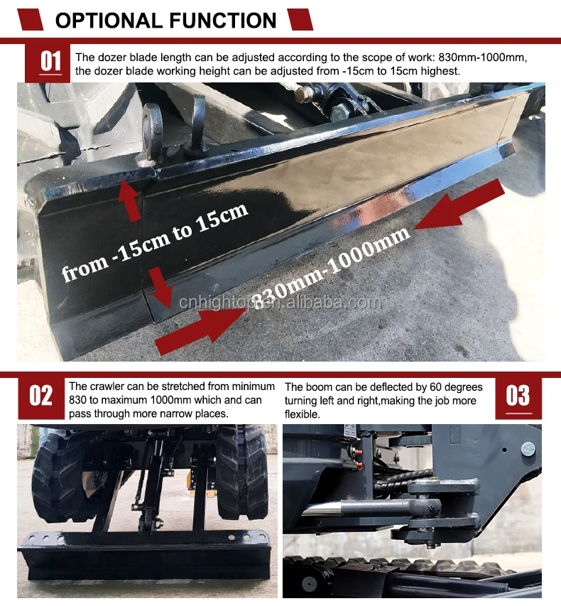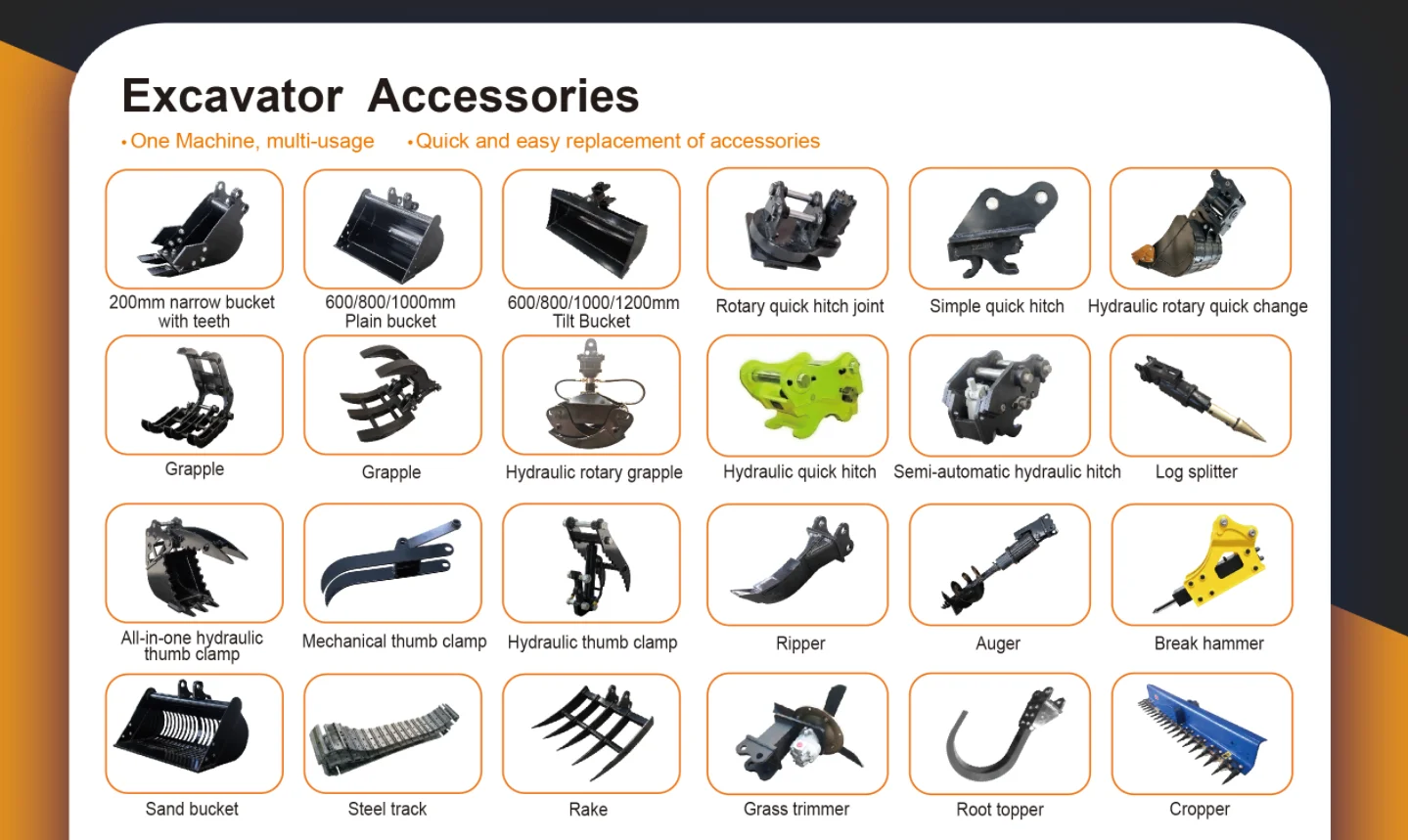 Mini excavator can used with many accessories, these attachments will give the excavator different and diverse functions.And the excavator and accessories will be packed into one wooden box, so that doesn't increase shipping cost.