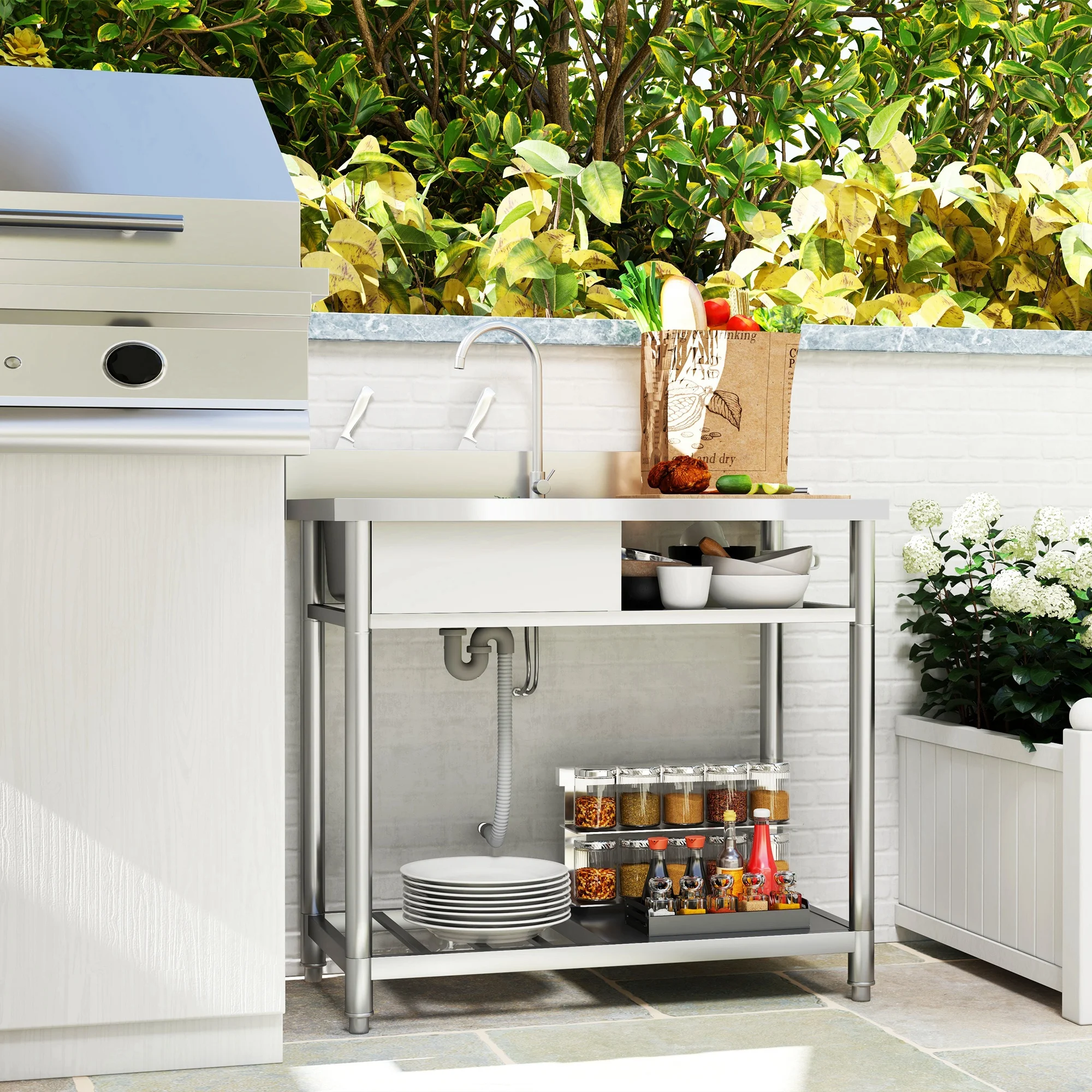 * Storage Shelf: This outdoor sink station offers storage space. A large shelf below lets you keep any garden, cooking, or laundry essentials close at hand.