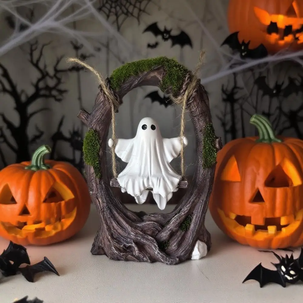1.Enthralling Swing Ghost Ornament: Our beloved ghost sits feebly on a rustic tree swing, capturing a whimsical blend of eerie and cute elements, making it an ideal choice for Halloween decor.