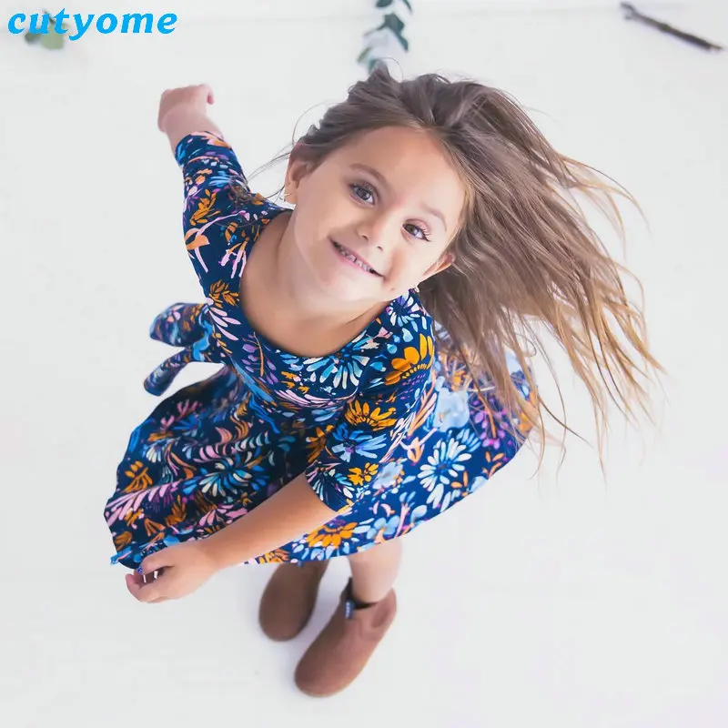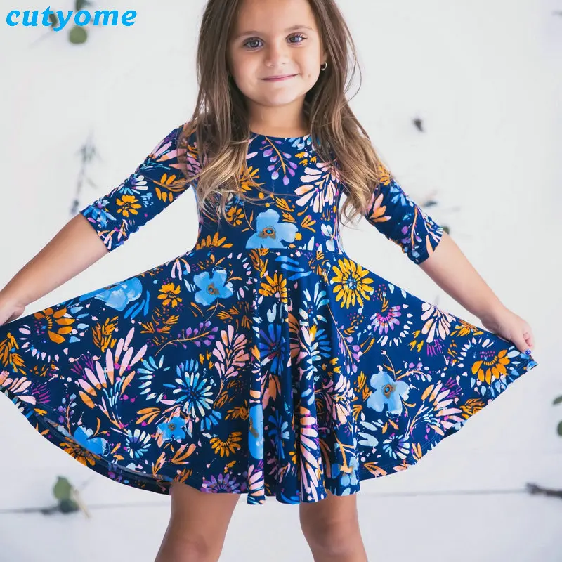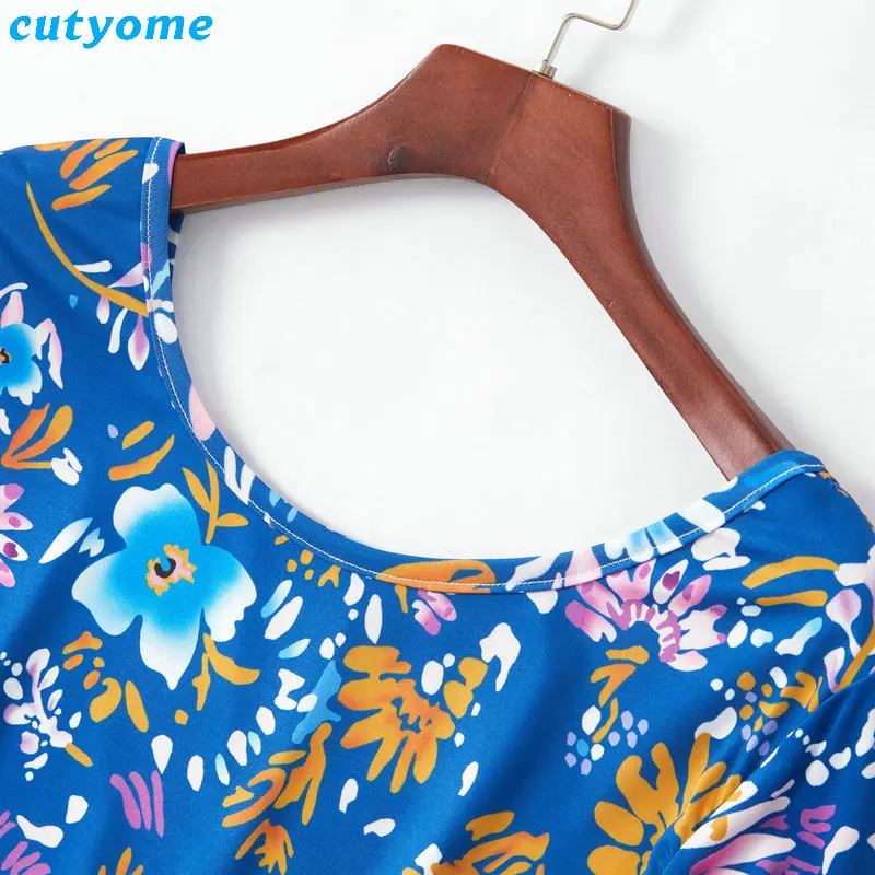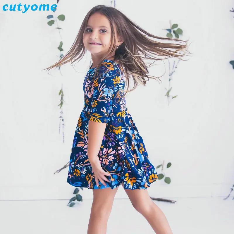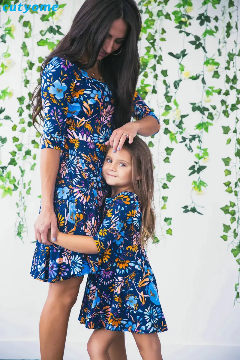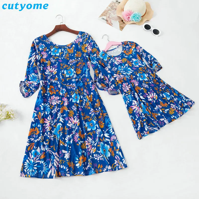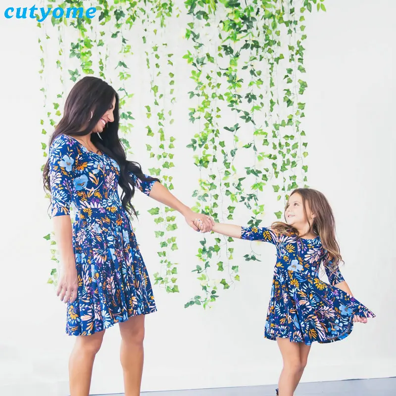 Mother Daughter Dresses Floral Print Half Sleeve Blue Dress Family Matching Outfits Mother/Mom and Daughter Dresses Clothes