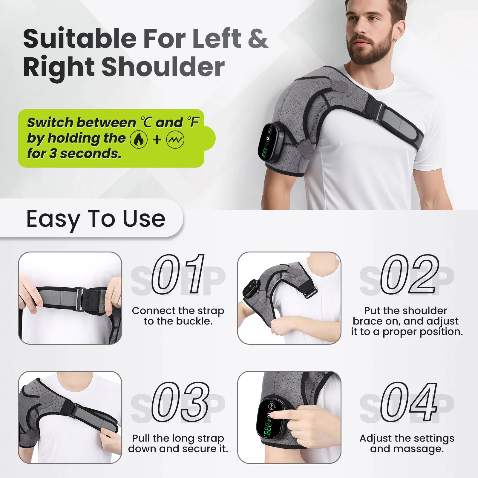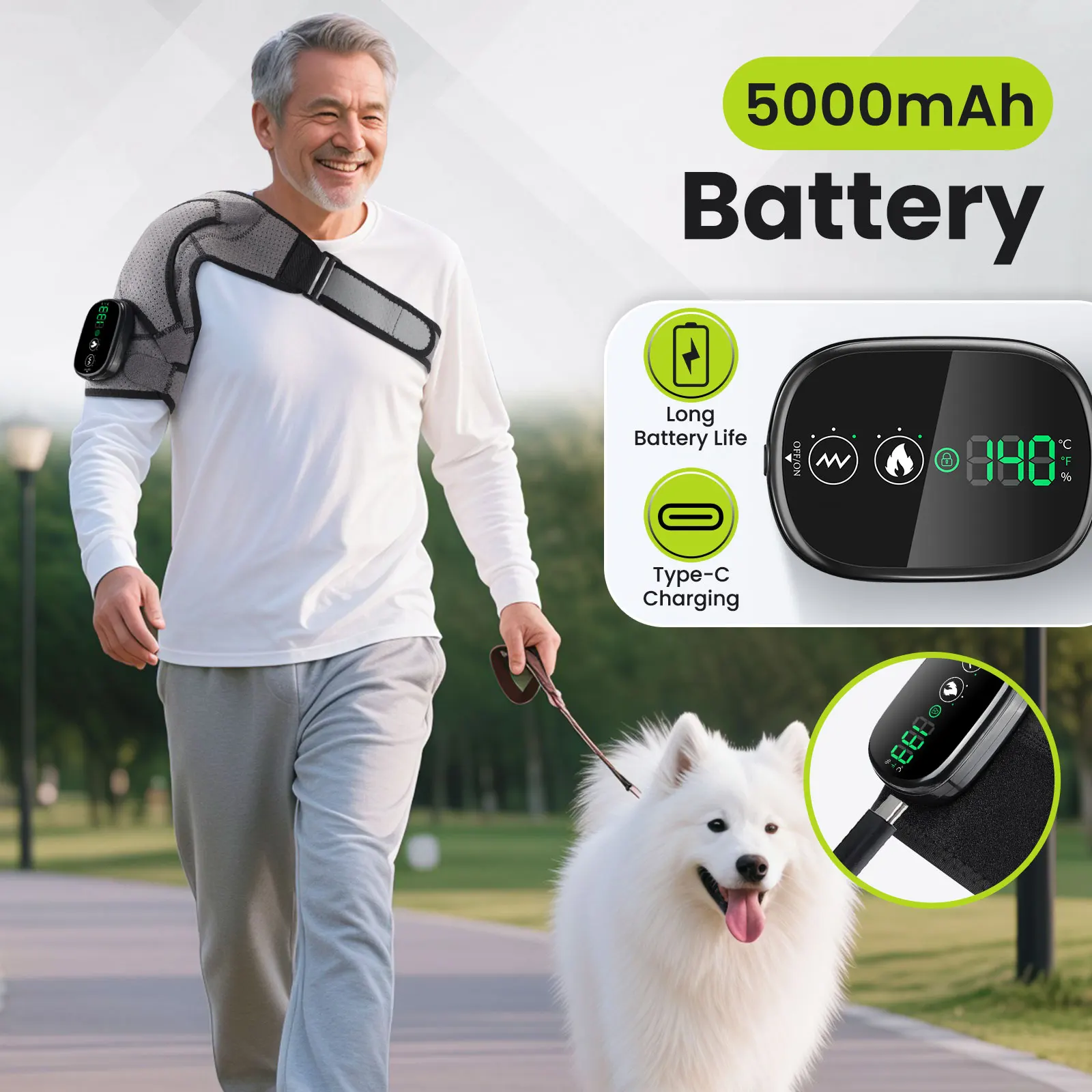 1.The perfect combination of 3-speed heat therapy and 3-speed vibration massage brings you the ultimate comfort experience, all-round care of your shoulder and neck health. 2.This massage shoulder pad can effectively relieve shoulder and neck pain, reduce your shoulder and neck pressure, let you always keep relaxed and happy state. 3.Built-in 5000mAh high-capacity battery, long-lasting life, a charge to meet the needs of the whole day, so you can enjoy a comfortable massage anytime, anywhere. 4.Exclusive digital display controller, high-definition display, fully functional buttons, dual temperature units of ℃ and ℉, touch screen operation is simple and convenient. 5.Lightweight and portable design allows our shoulder pads to provide you with attentive care at any time whether you are traveling or on business.
