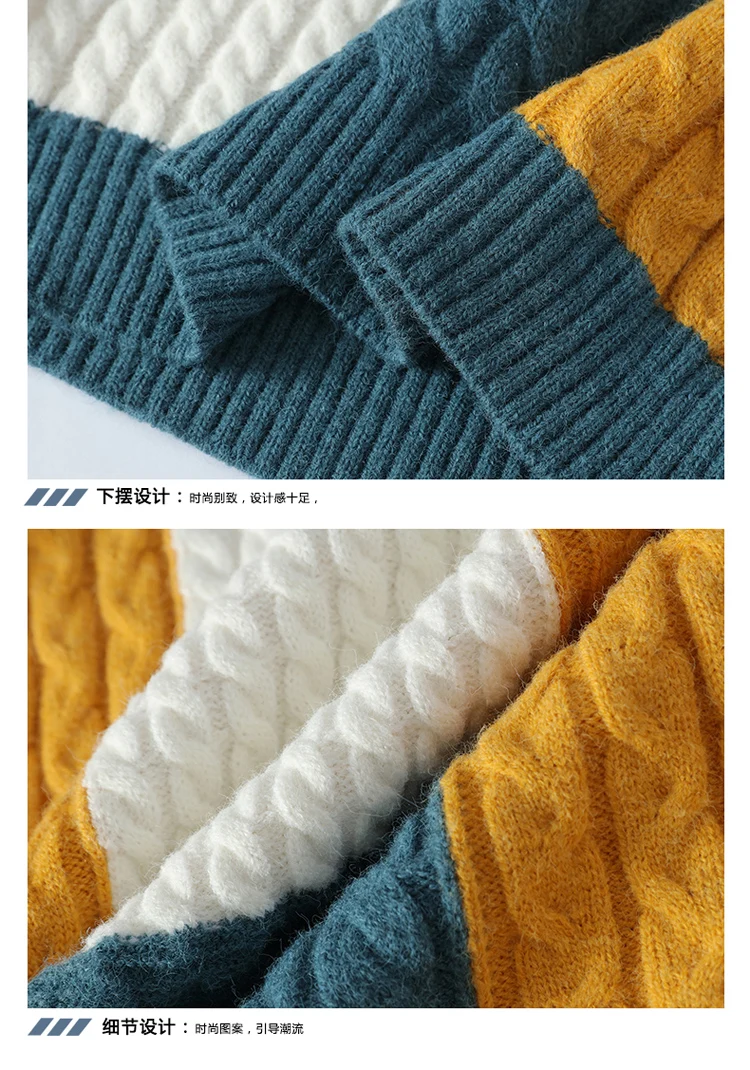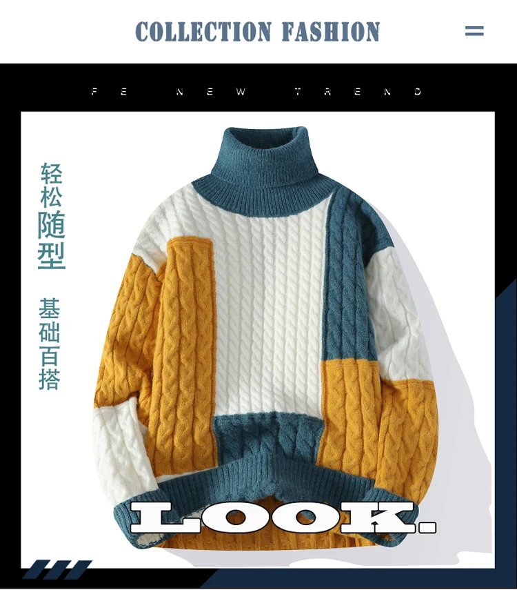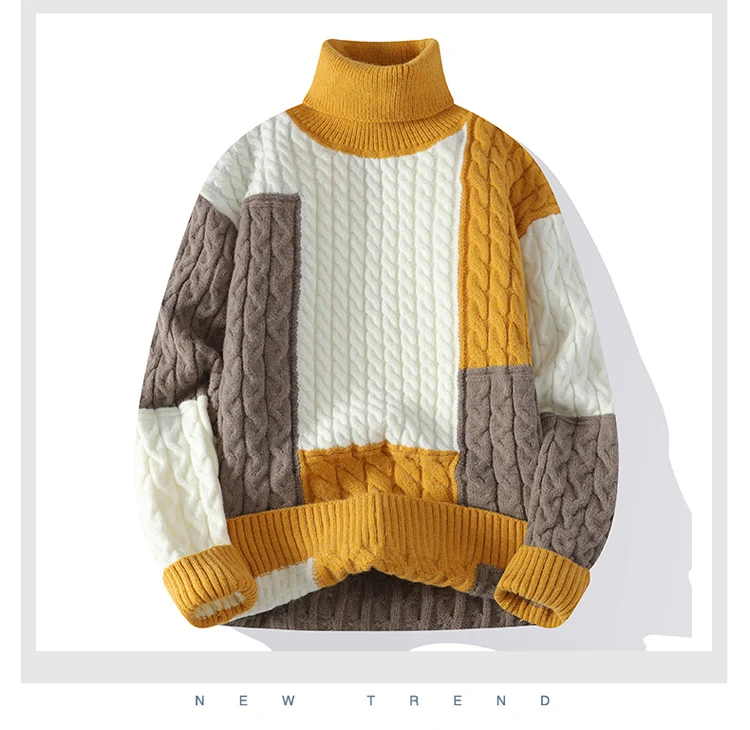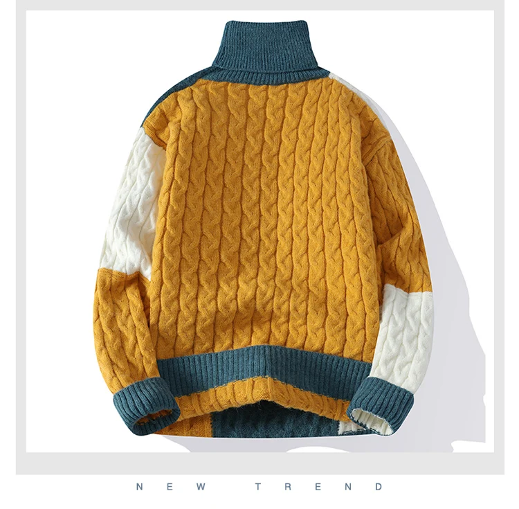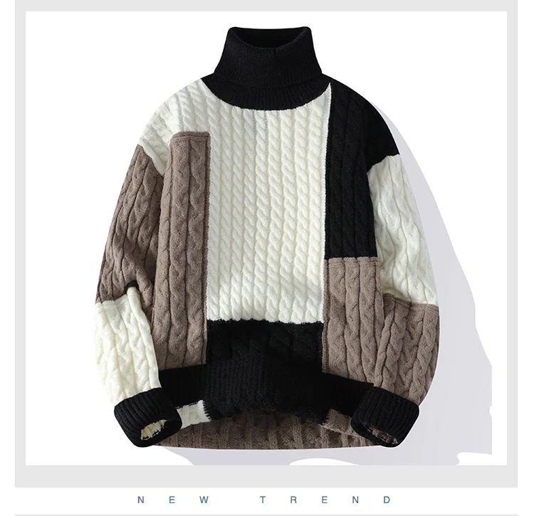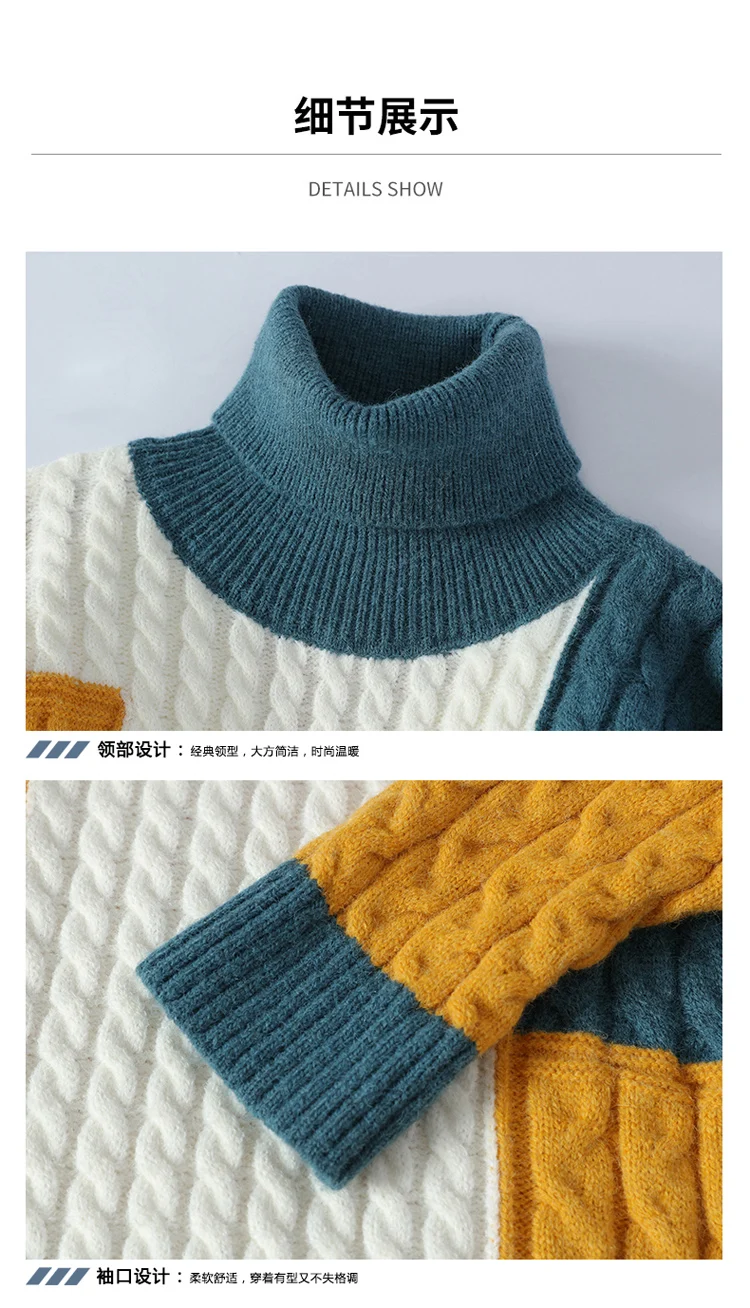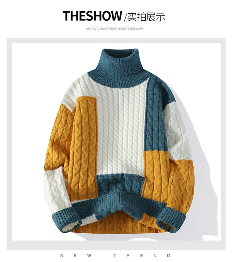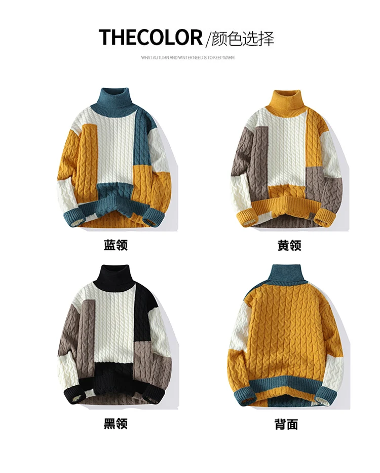 Winter New Contrast Color Turtleneck Sweaters Men's Thicken Warm Knitting Pullovers Loose Comfortable Casual Knitwear